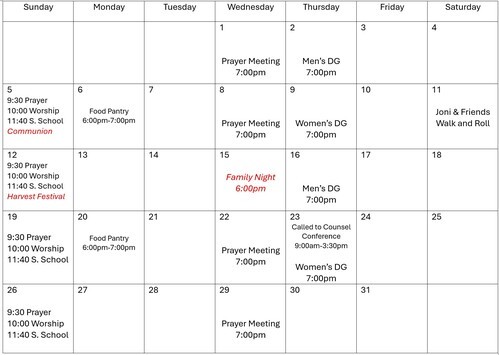 For our fall programs: The Joni and Friends Walk and Roll Fundraiser on October 11, the Harvest Festival on October 12th, the Mission trip to ROM from October 14-21, the October 18 Harvest Festival ROM will be held for the community, and the "Called to Counsel conference on October 23.